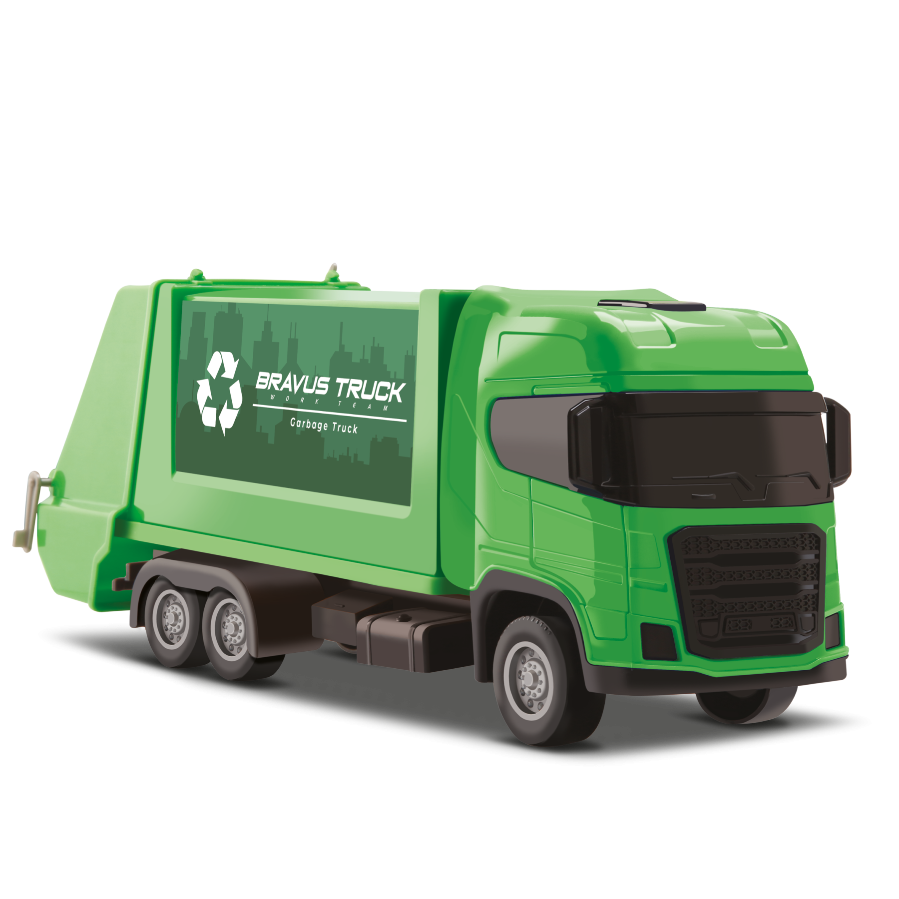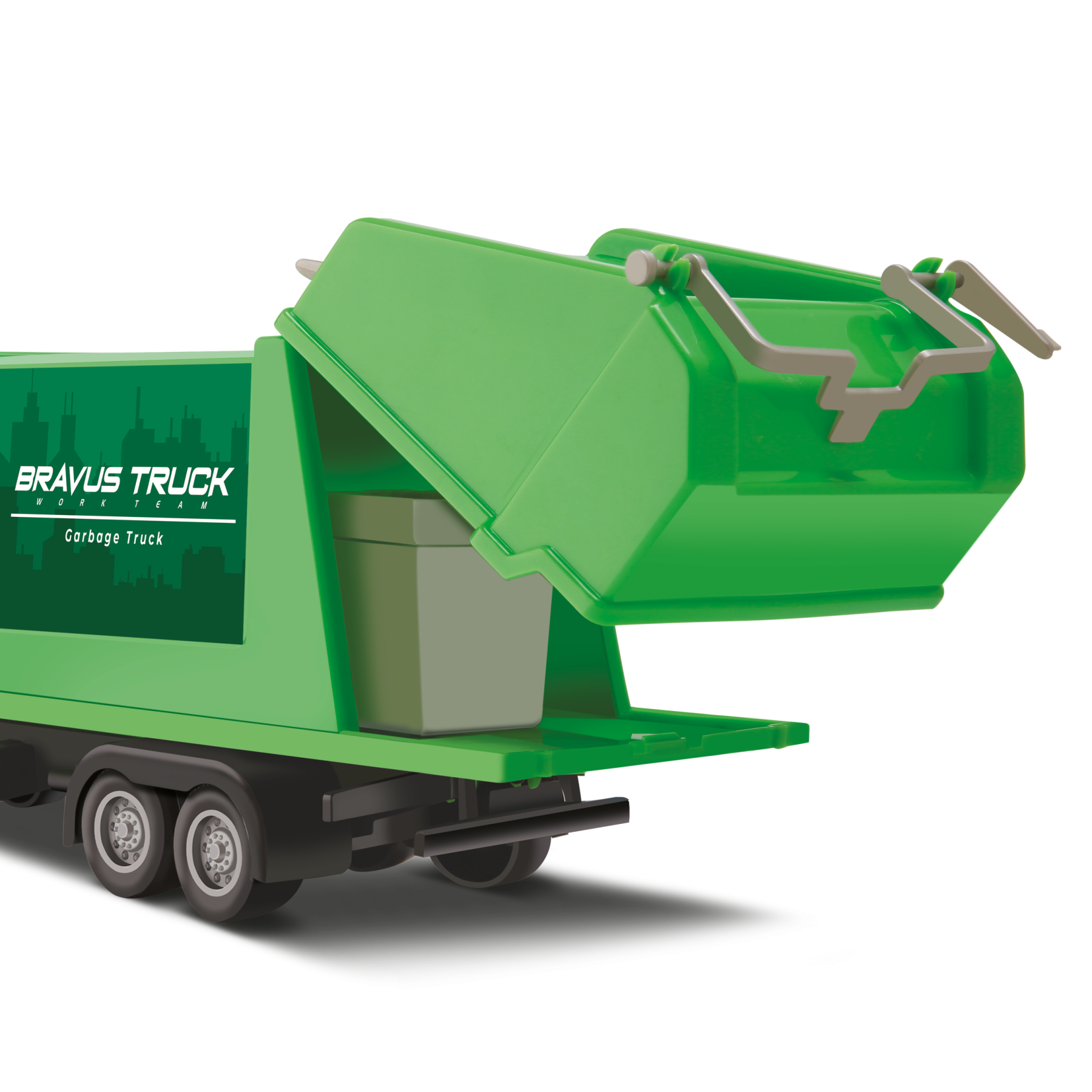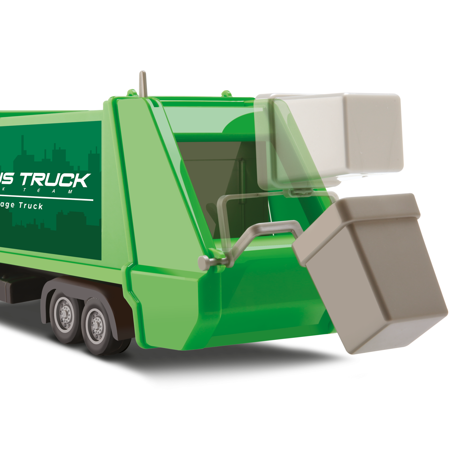 O caminhão de lixo vem com mecanismo que simulam o funcionamento real da coleta de lixo, como a possibilidade de levantar os compartimentos ou basculá-los para esvaziar o conteúdo. - Informação Adicional